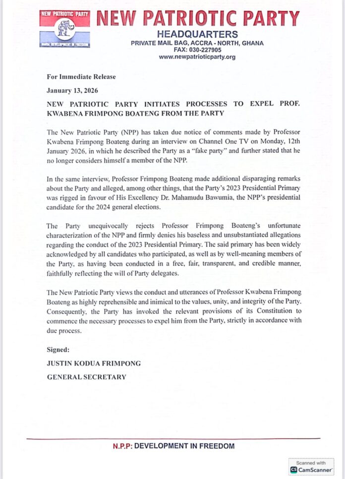 The New Patriotic Party (NPP) has formally begun internal disciplinary processes to expel Professor Kwabena Frimpong-Boateng, following comments he made during a recent television interview that the party says undermine its integrity, unity, and constitutional values. The move marks a significant escalation in tensions between the party and one of its prominent figures, drawing national attention to issues of internal democracy, party discipline, and political accountability.