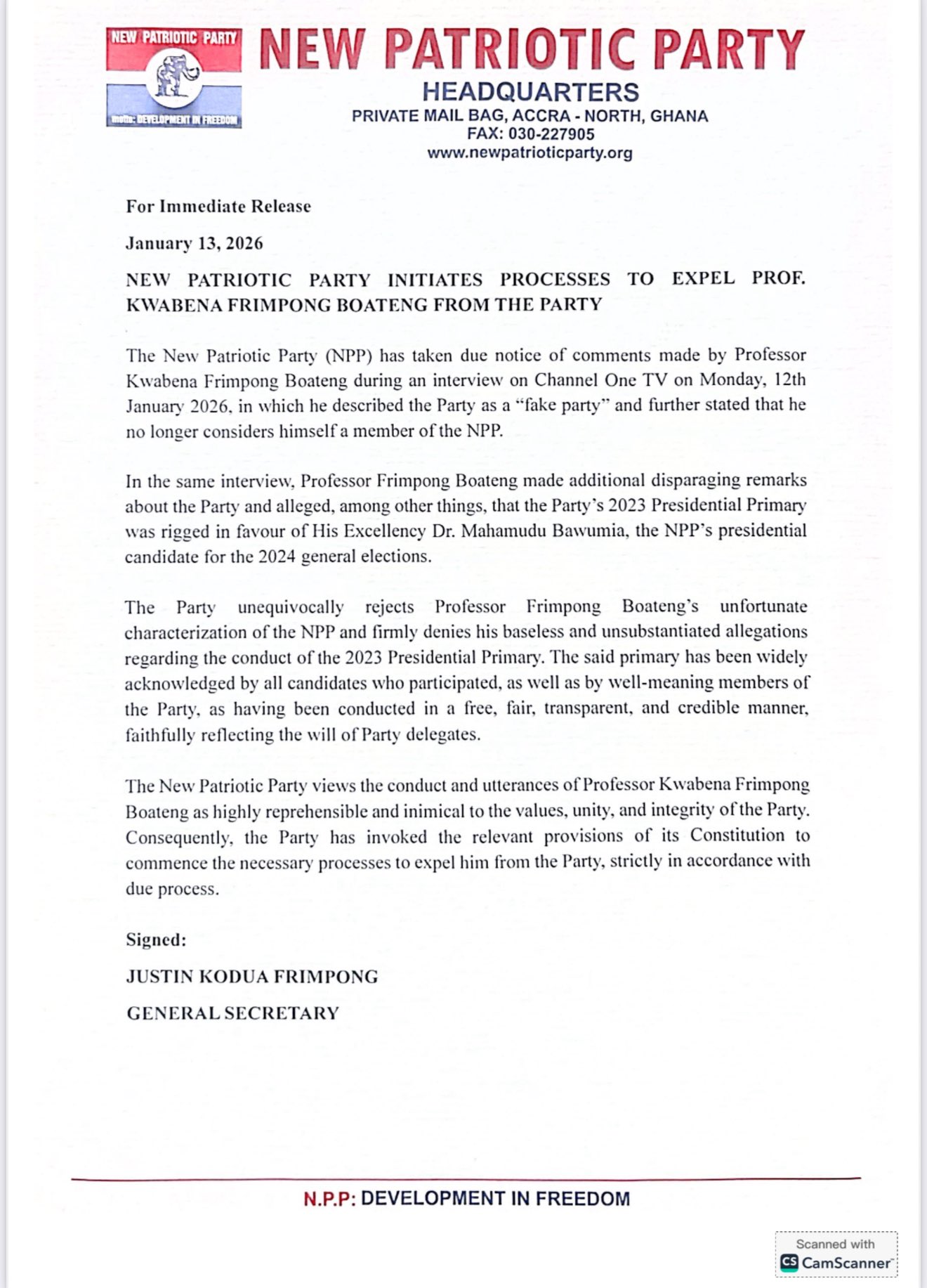 In an official statement issued from the party’s national headquarters in Accra and dated January 13, 2026, the NPP confirmed that it had taken “due notice” of remarks made by Prof. Frimpong-Boateng during an interview on Channel One TV on January 12, 2026. During the interview, the former party stalwart reportedly described the NPP as a “fake party” and publicly stated that he no longer considered himself a member of the governing political organization.