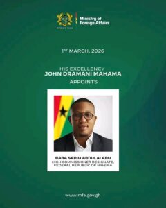 Baba Sadiq Abdulai Abu’s appointment will be subject to the necessary diplomatic protocols, including agrément from Nigerian authorities and confirmation processes under Ghana’s constitutional framework. Once formally sworn in and accredited, he will assume full responsibilities at Ghana’s High Commission in Abuja.