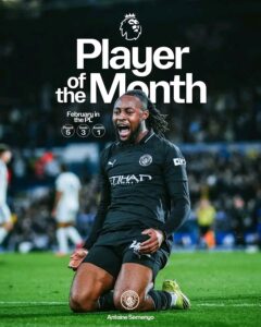 His February form demonstrated exactly why the club moved to sign him. In five league matches during the month, Semenyo scored three goals and created another, helping Manchester City maintain an unbeaten run in the competition. His performances included influential displays against sides such as Fulham, Leeds United and Tottenham Hotspur, where his attacking movement and finishing proved decisive in key moments.